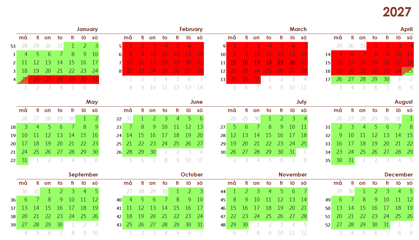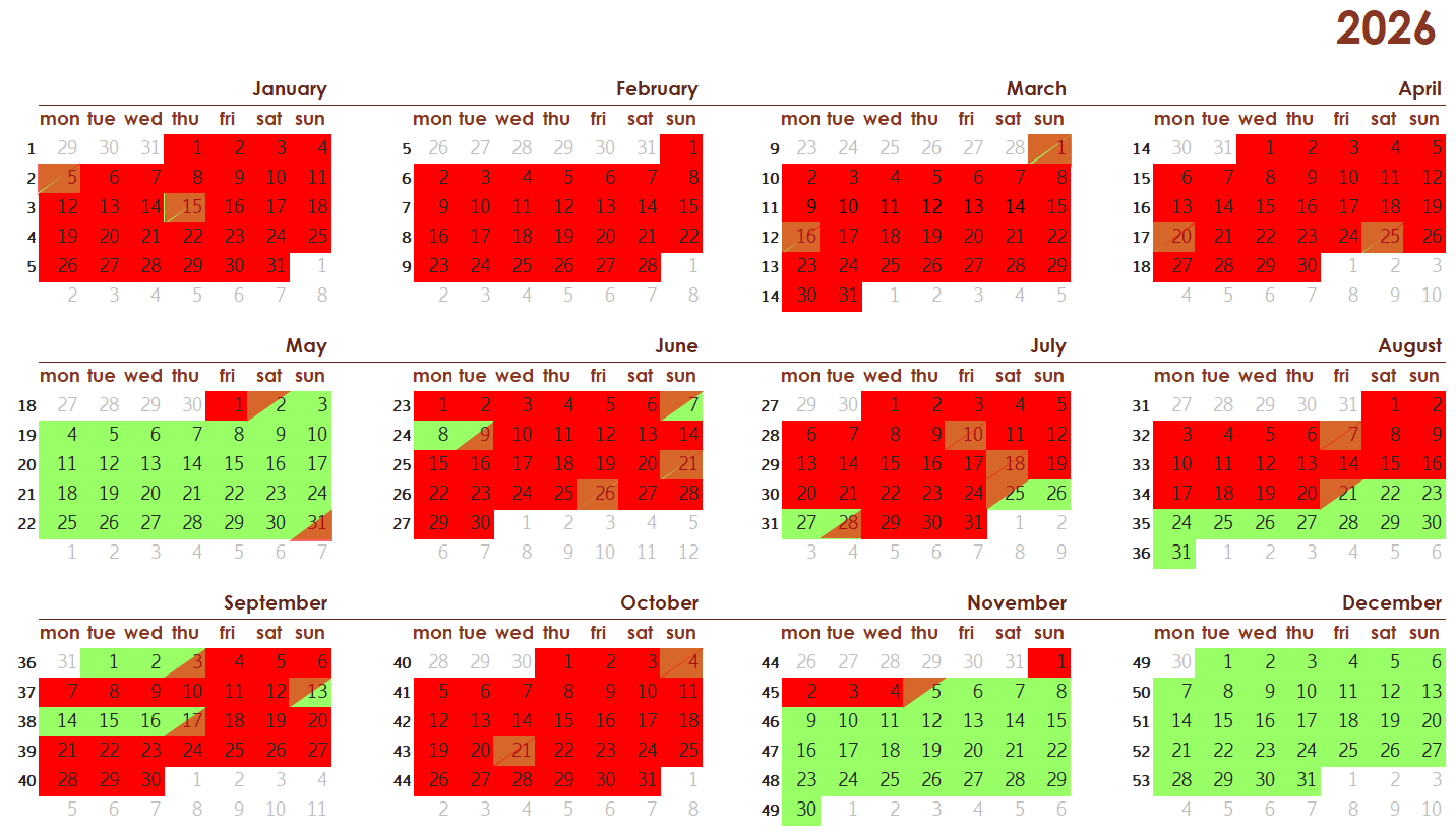 In this calendar you can see which dates are available. Red marked days are booked and green marked days the apartment is available from 4 pm. Red/green day is bookable.