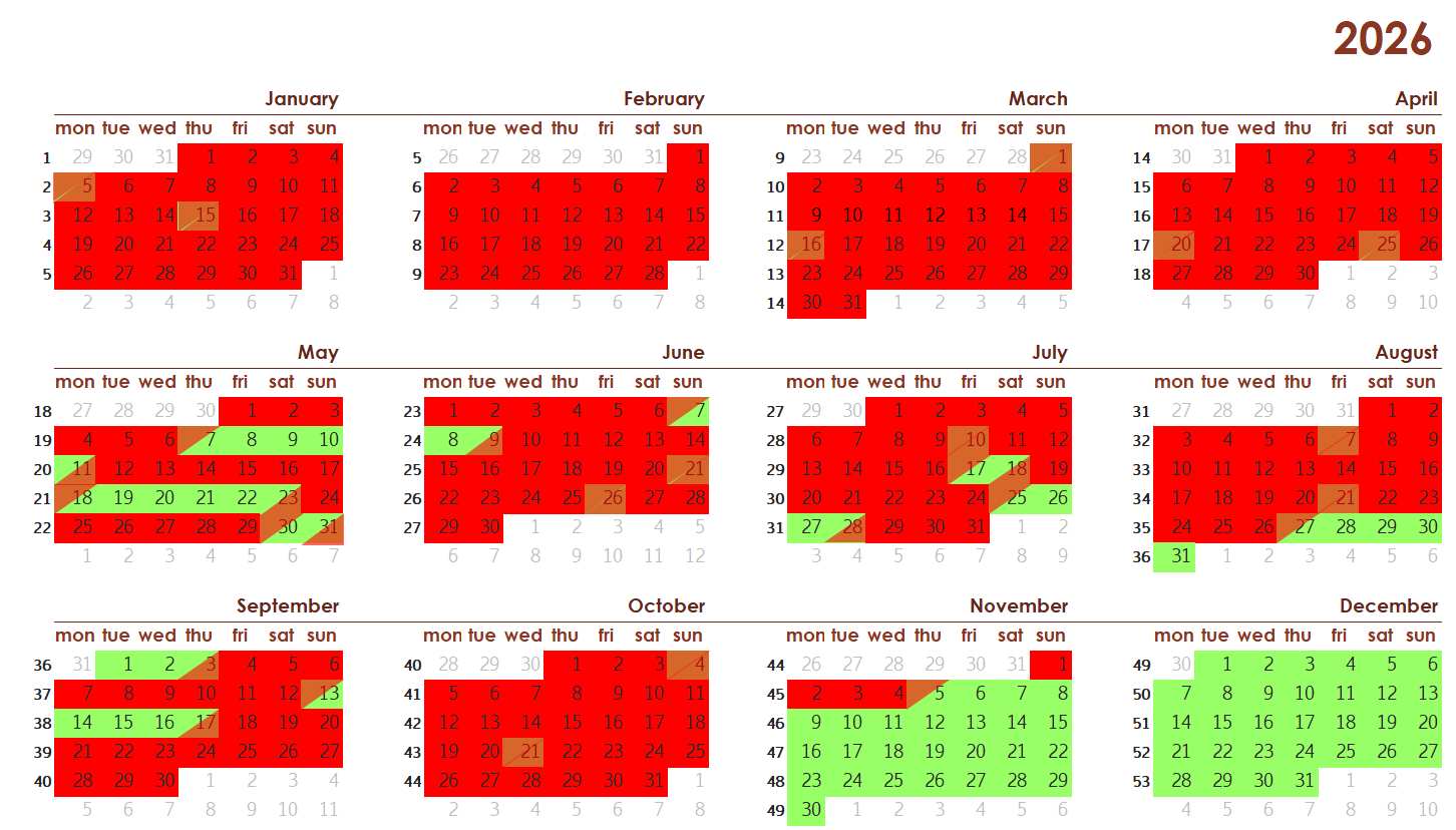 In this calendar you can see which dates are available. Red marked days are booked and green marked days the apartment is available from 4 pm. Red/green day is bookable.