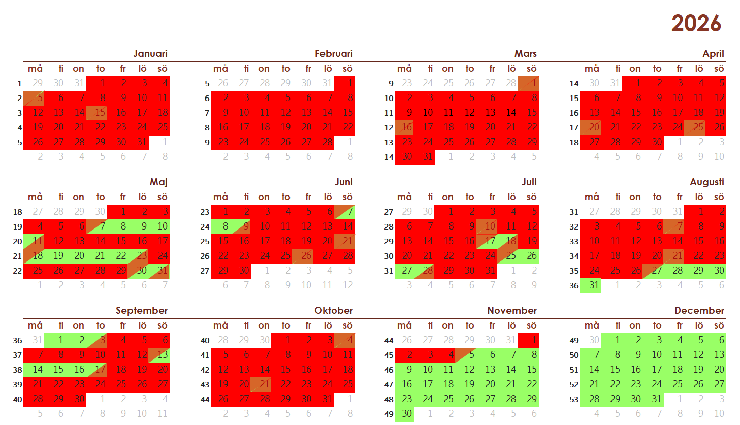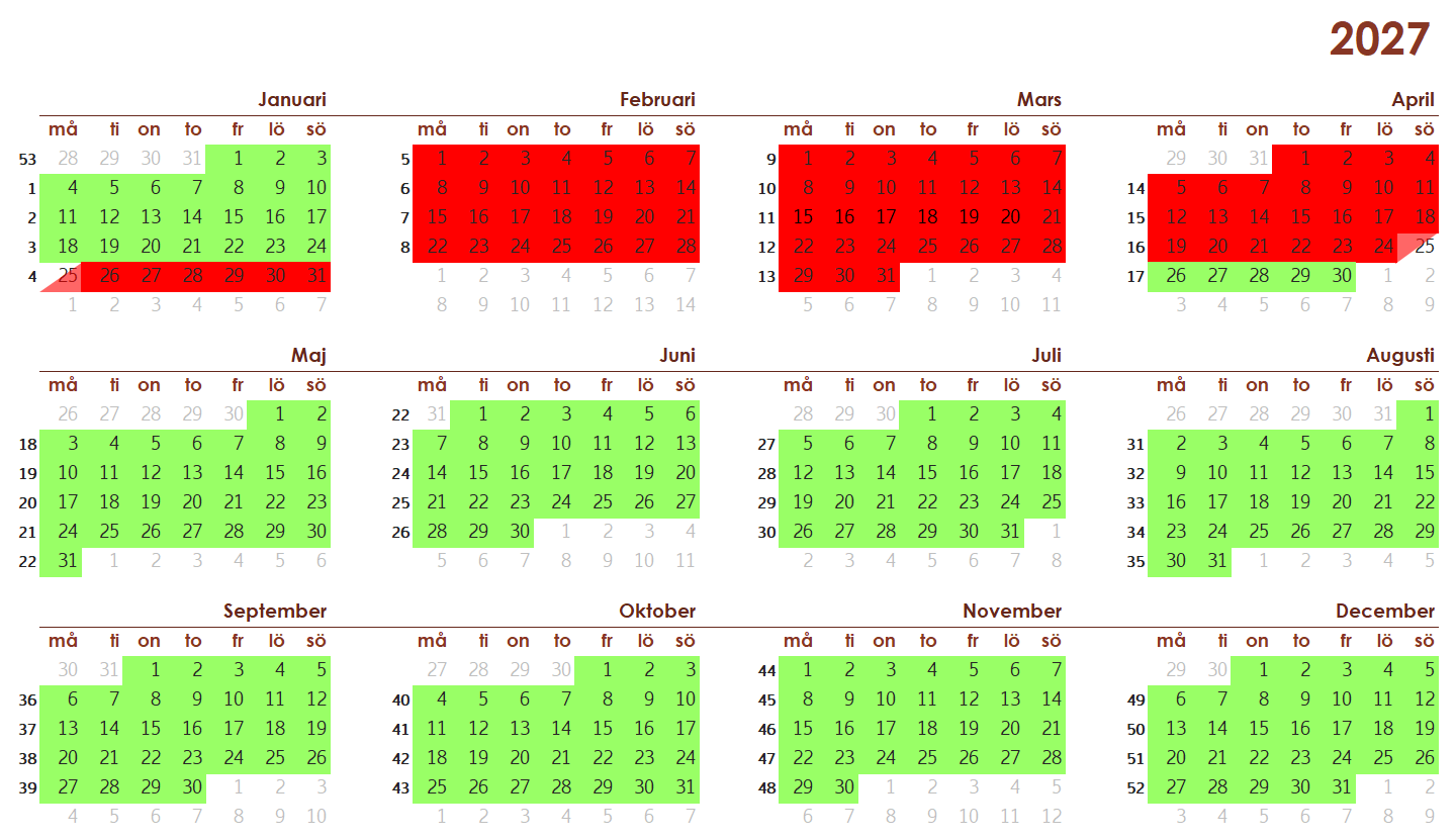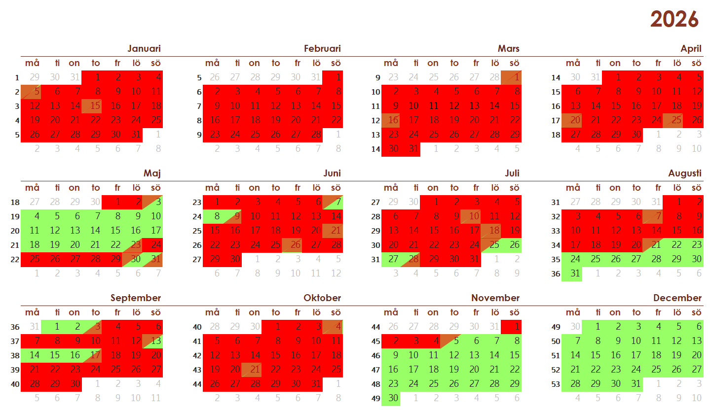 I den här kalendern kan ni se vilka datum som är lediga. Rödmarkerade dagar är bokade och de grönmarkerade dagarna är lägenheten ledig från kl. 16.00. Röd/grön dag är utflyttningsdag och är bokningsbar.